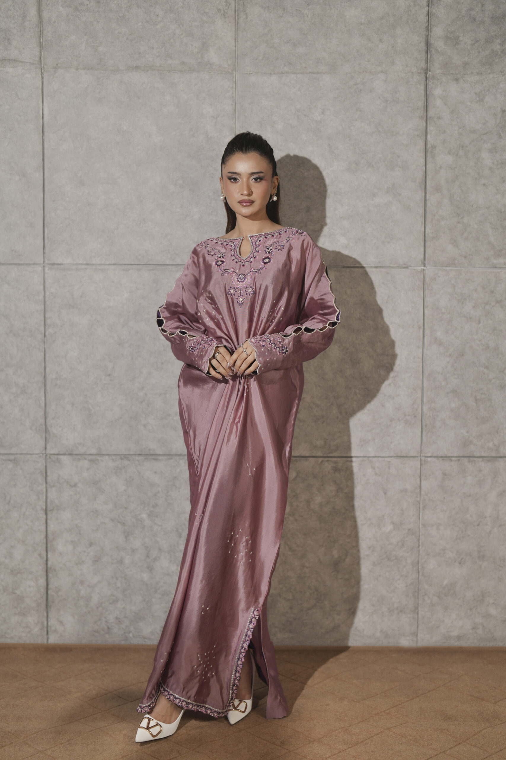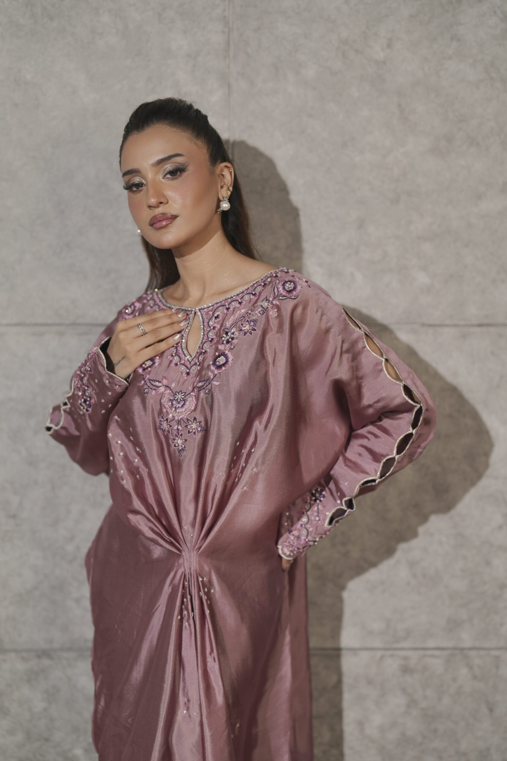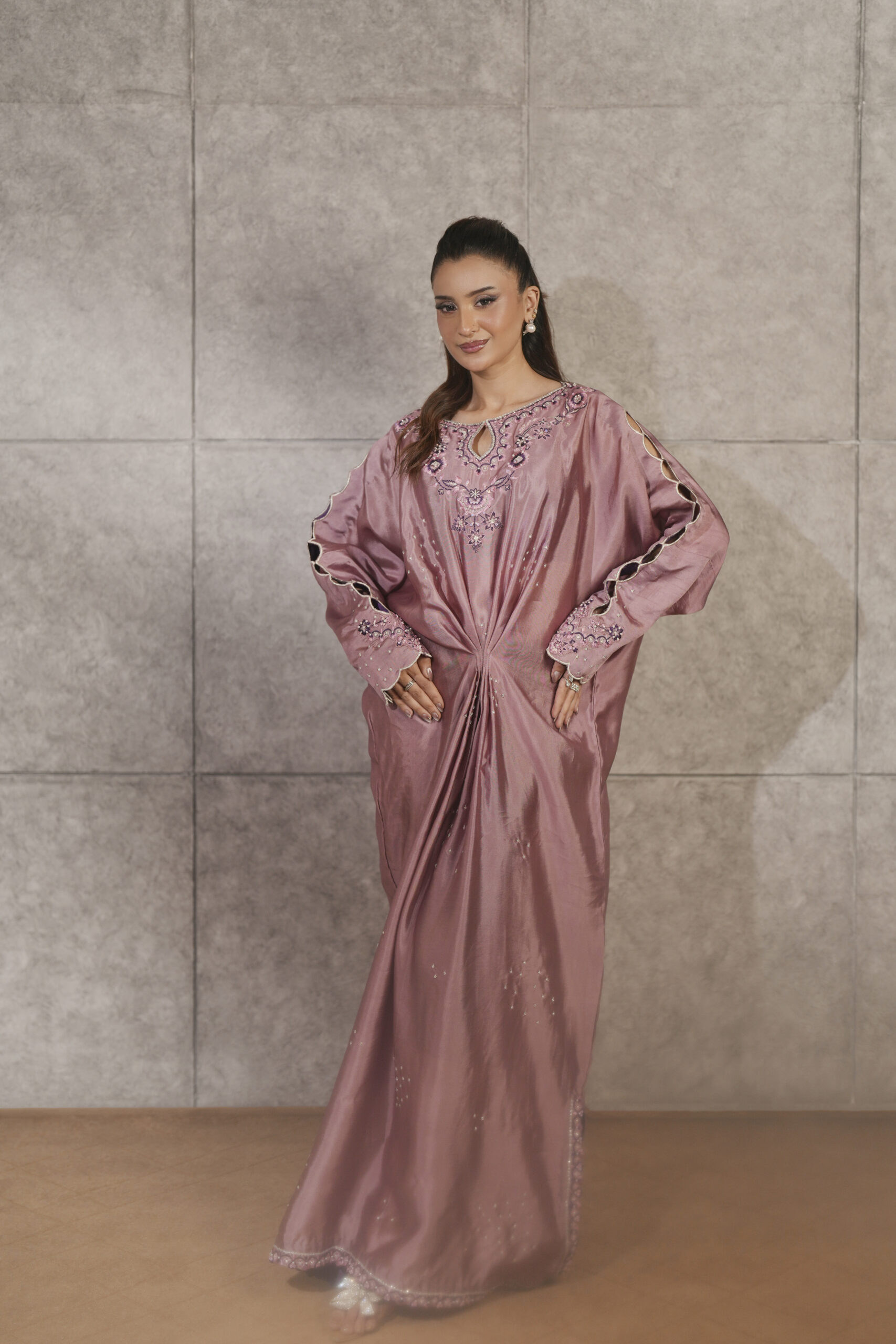 Crafted from luminous sheen of pure dusty pink sheesha silk, this elegant pleated kaftaan is accented by a striking combination of violet silk thread embroidery on neckline, sleeves and side slits enriched with shimmering Swarovski crystals. Intricate cutwork detailing on the sleeves adds a layer of delicate sophistication while hand embellished scattered bunches along the front catches the light with every movement. A perfect fusion of traditional craftsmanship and modern fluid, this piece is designed for the woman who seeks sophisticated, one-of-a-kind luxury.
