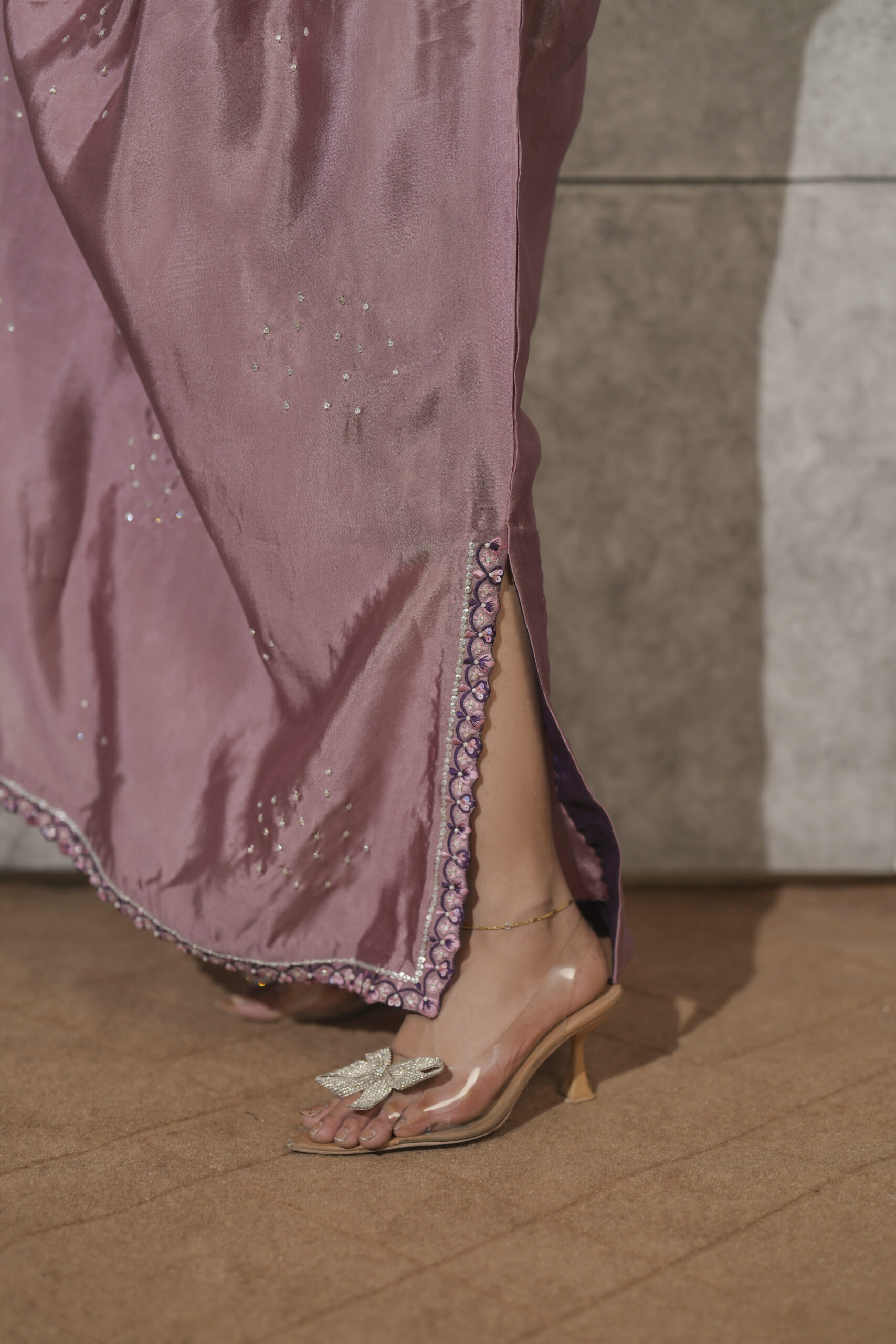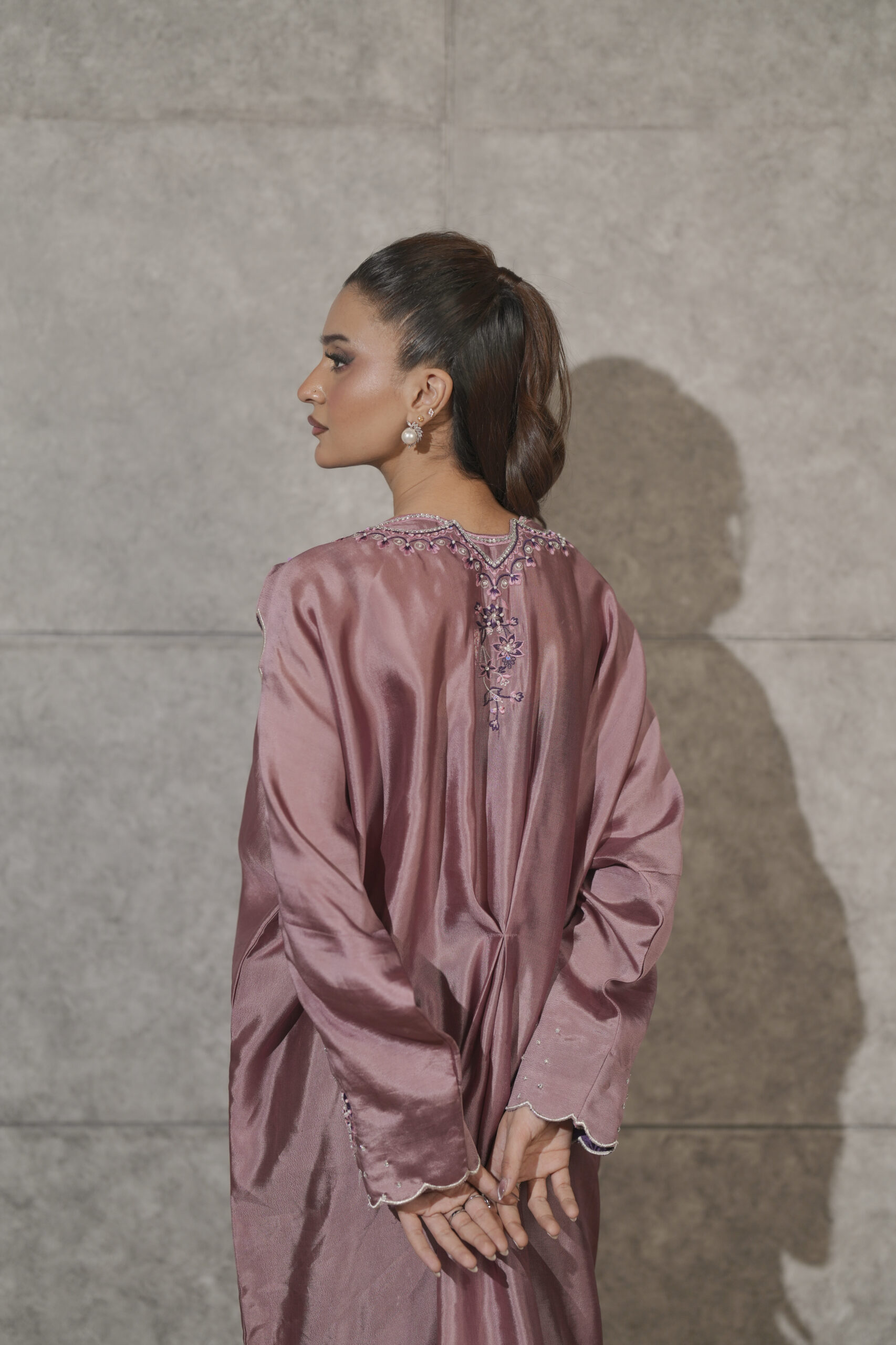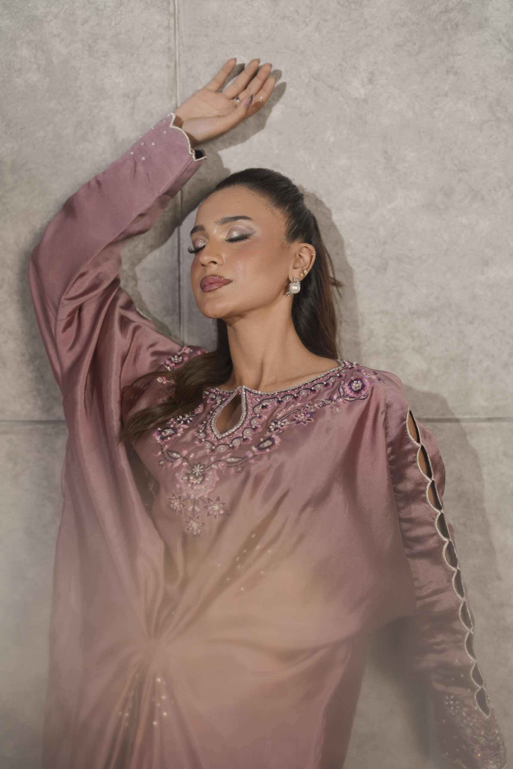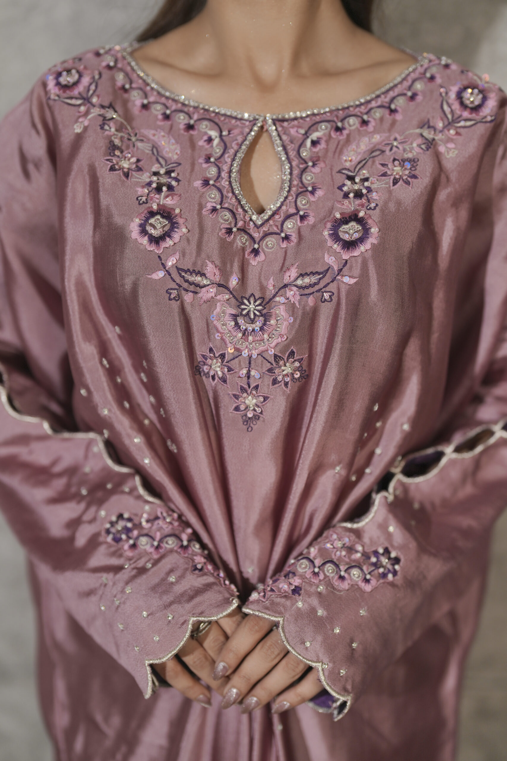 Crafted from luminous sheen of pure dusty pink sheesha silk, this elegant pleated kaftaan is accented by a striking combination of violet silk thread embroidery on neckline, sleeves and side slits enriched with shimmering Swarovski crystals. Intricate cutwork detailing on the sleeves adds a layer of delicate sophistication while hand embellished scattered bunches along the front catches the light with every movement. A perfect fusion of traditional craftsmanship and modern fluid, this piece is designed for the woman who seeks sophisticated, one-of-a-kind luxury.