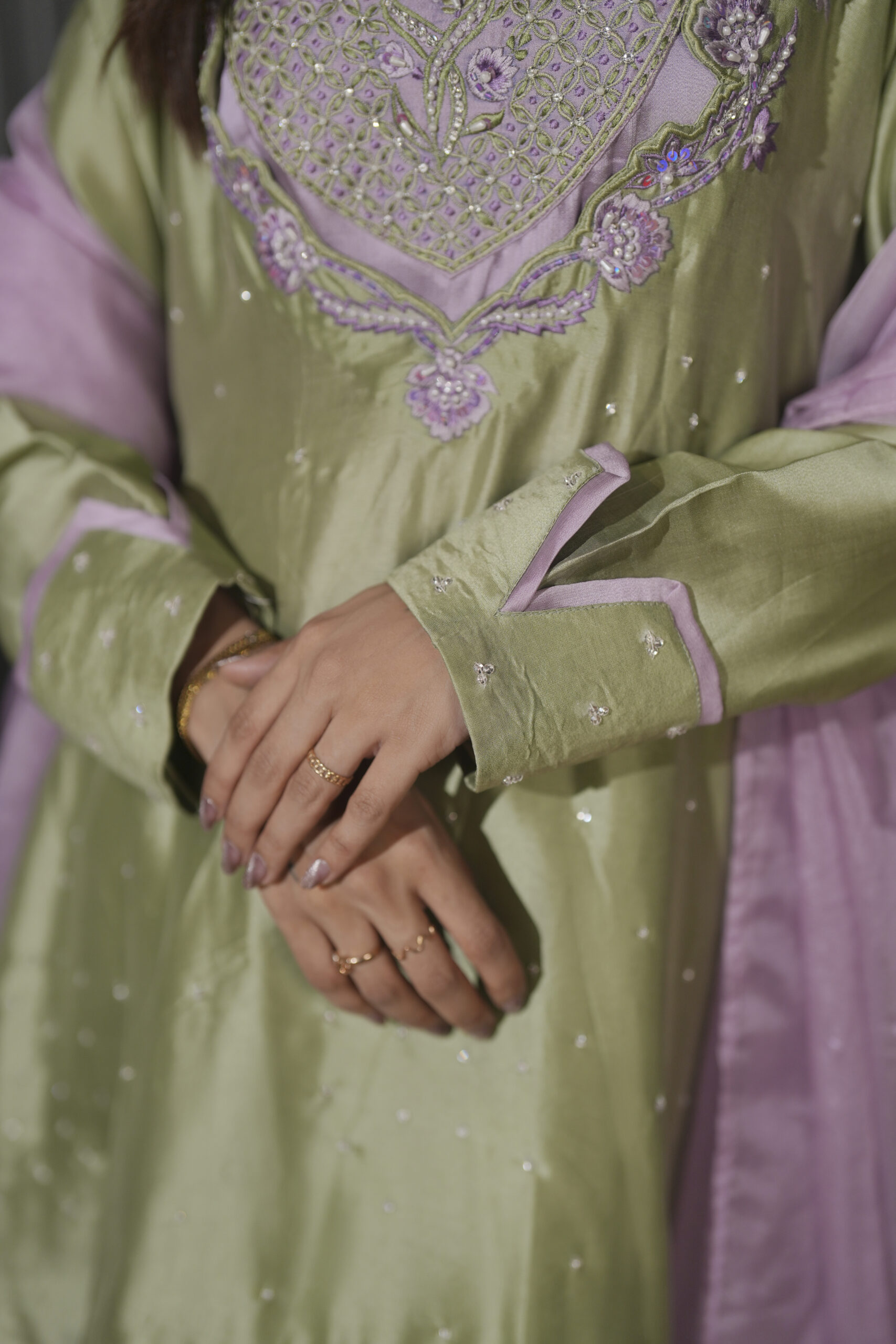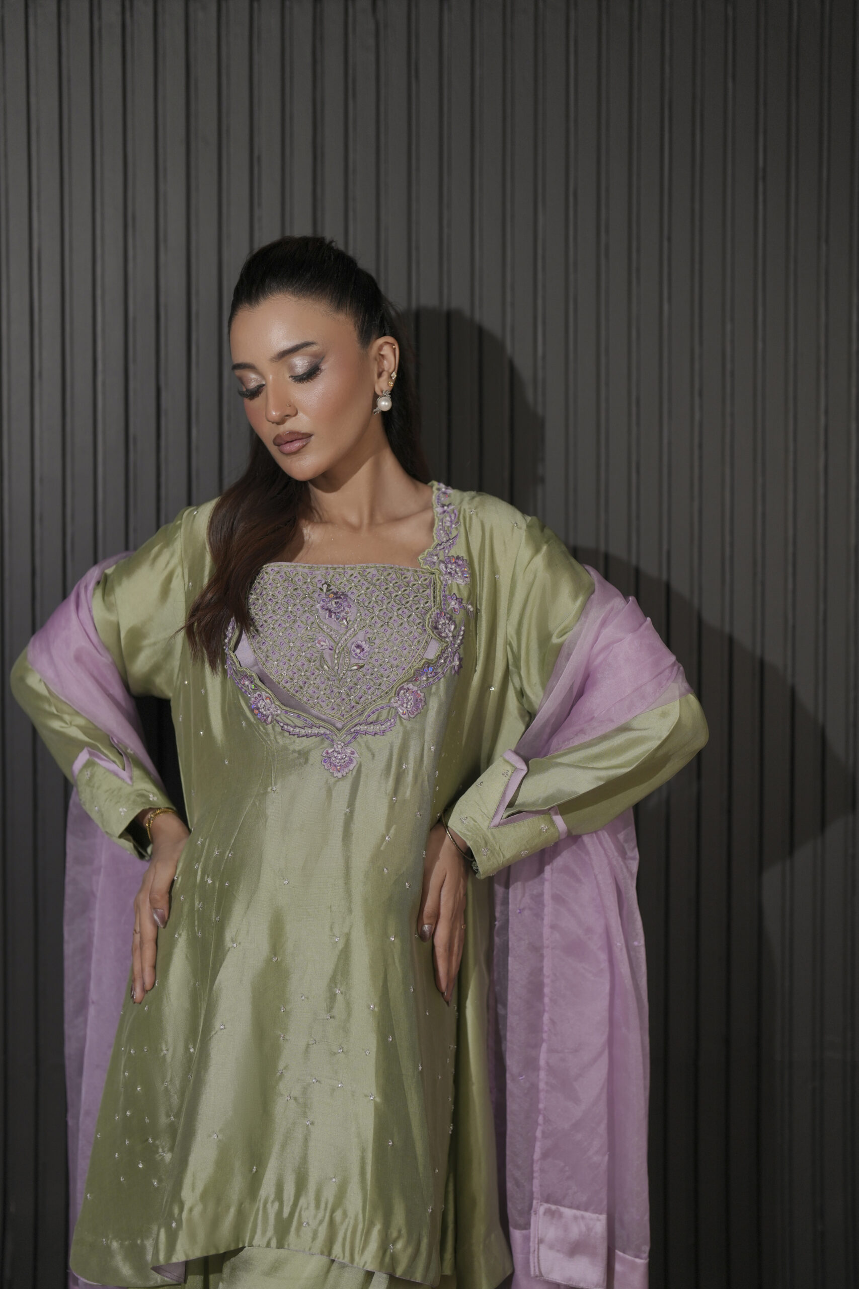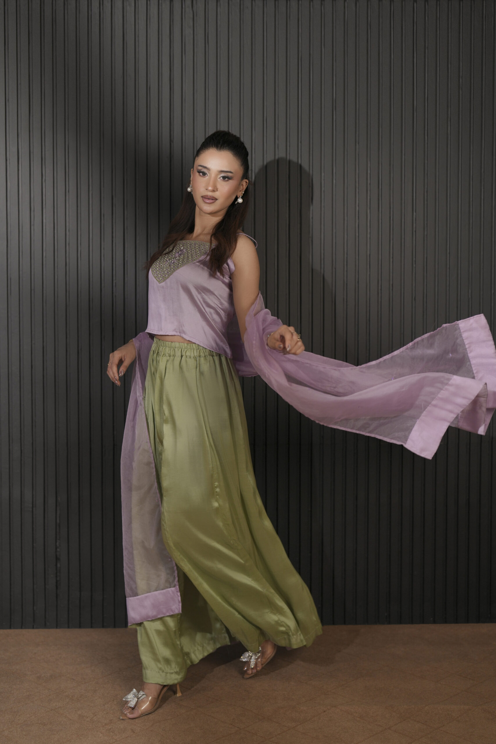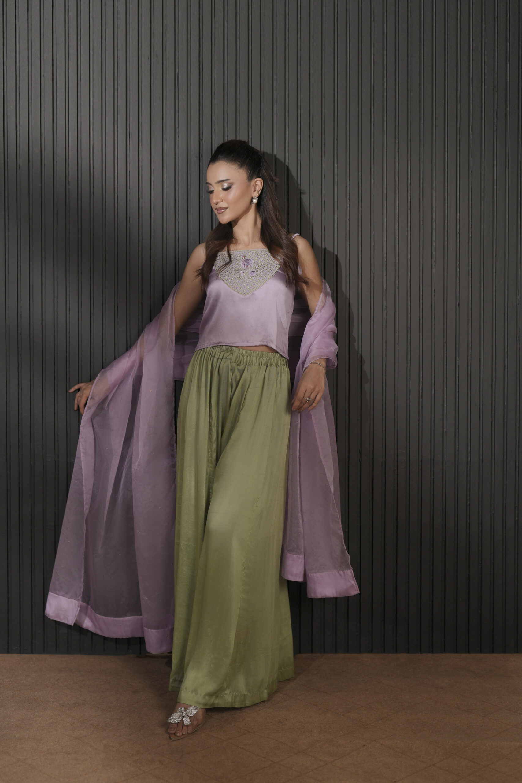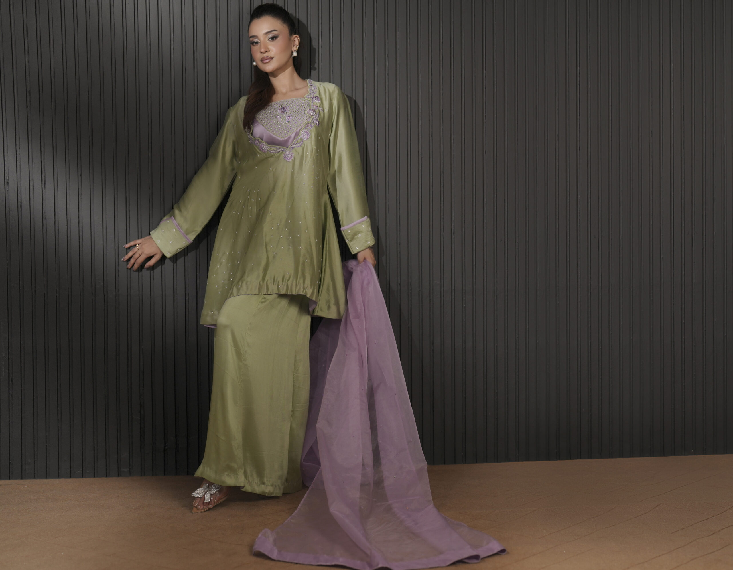 The silhouette is anchored by flowing wide-leg flared culottes that provide a graceful, rhythmic movement with every step. To complete the look, a sheer organza dupatta is adorned with scattered sequins, adding a layer of soft brilliance. It is designed for the woman who appreciates subtle luxury and modern silhouettes.