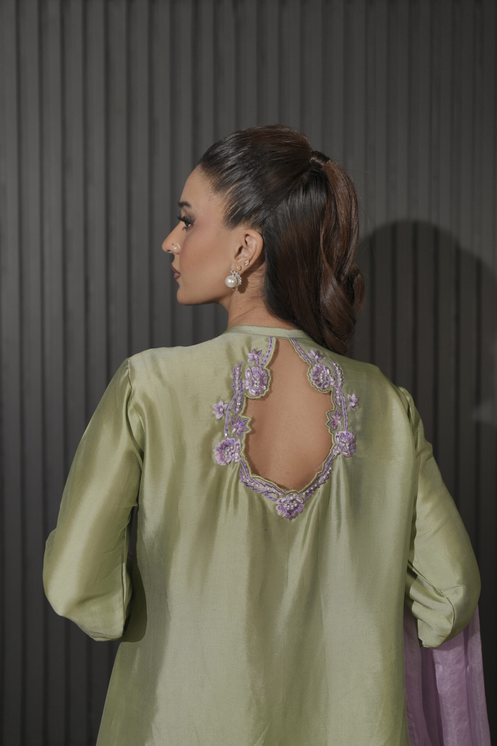 Crafted from pure sheesha silk, this ensemble features an embroidered modern inner slip with a meticulously embroidered A-line peplum on front and a contemporary minimalist back neck design. The statement two-tone sleeves offer a bold visual contrast, further elevated by delicate hand-embellishments of shimmering rice pearls, swaroski crystals and sequins.