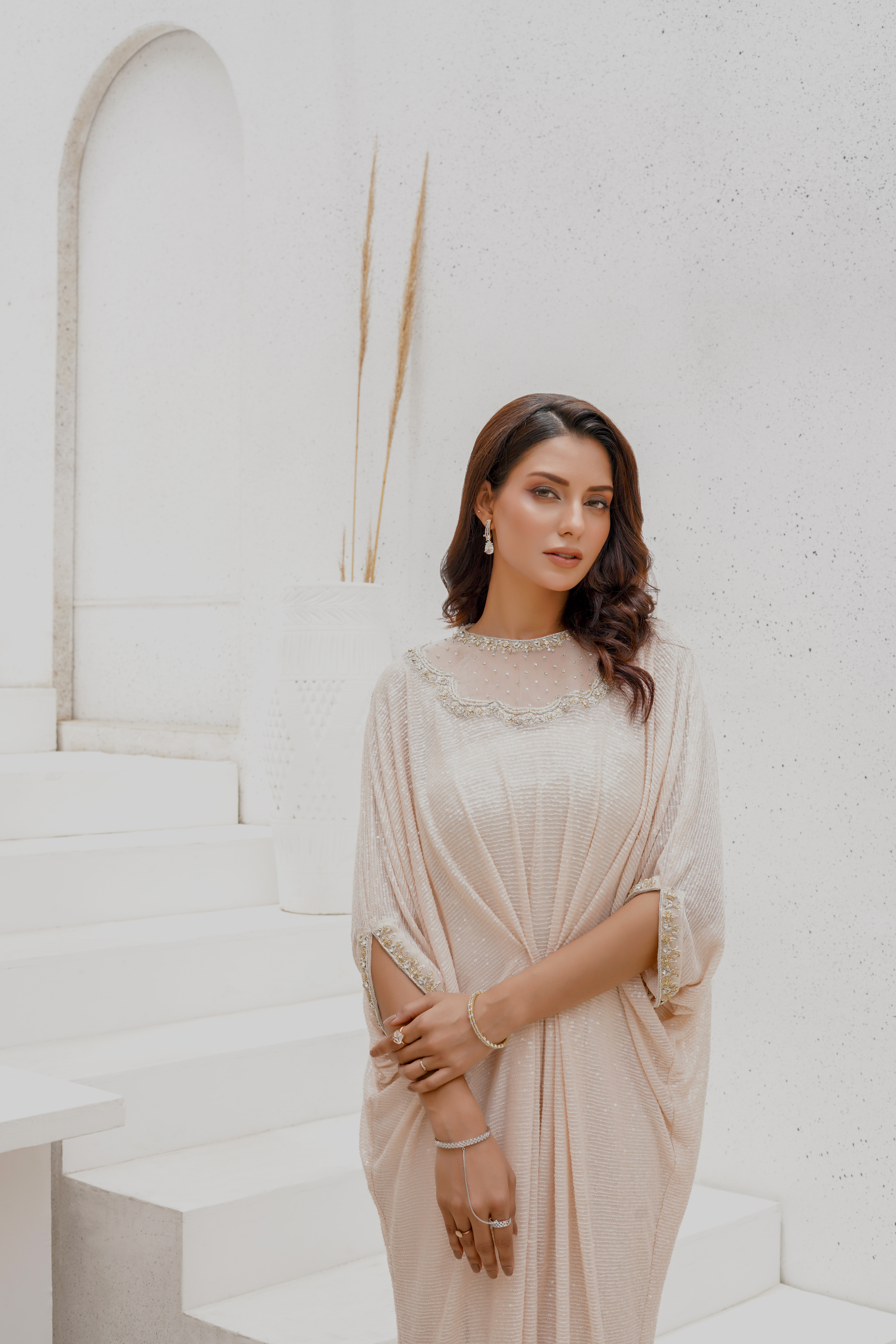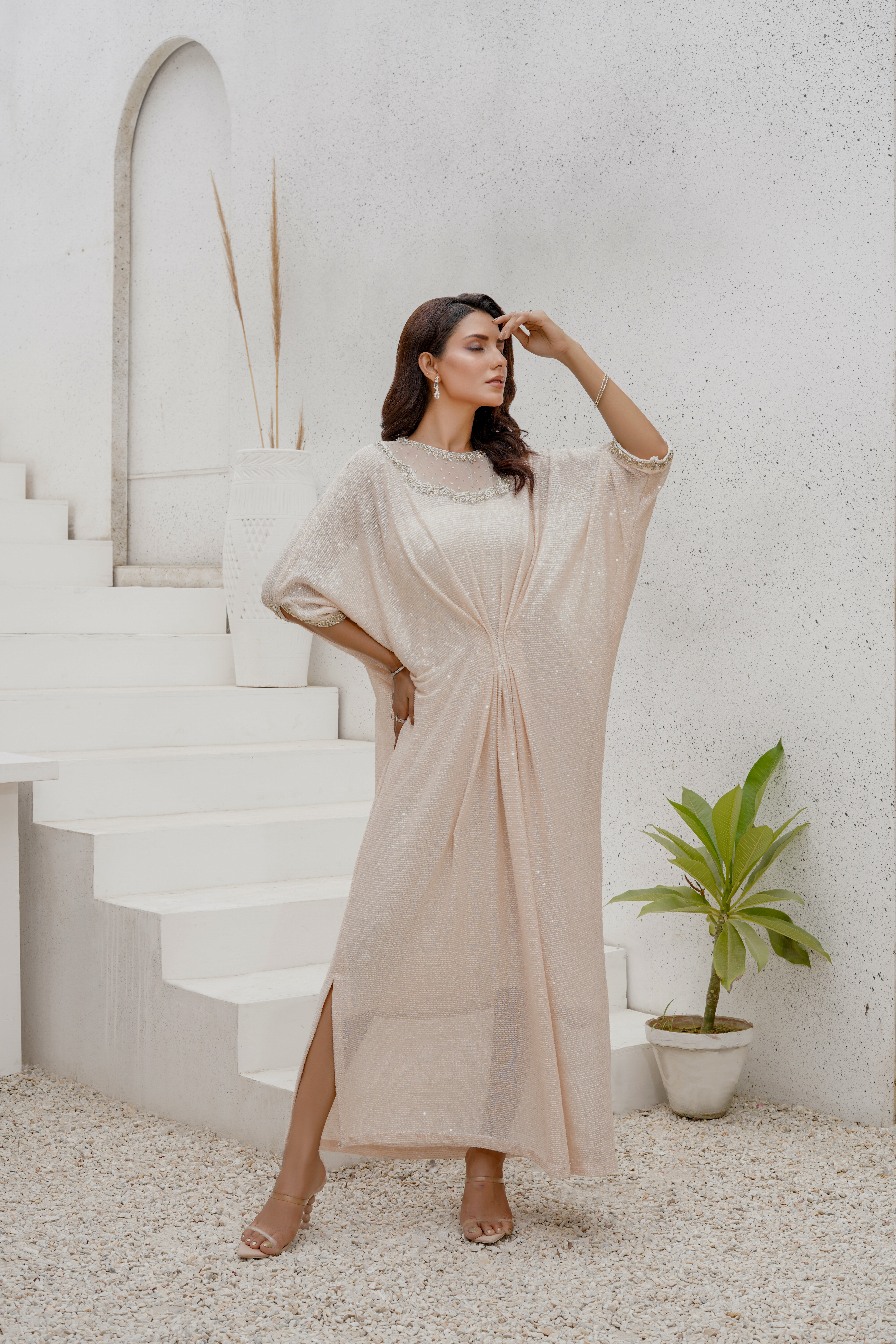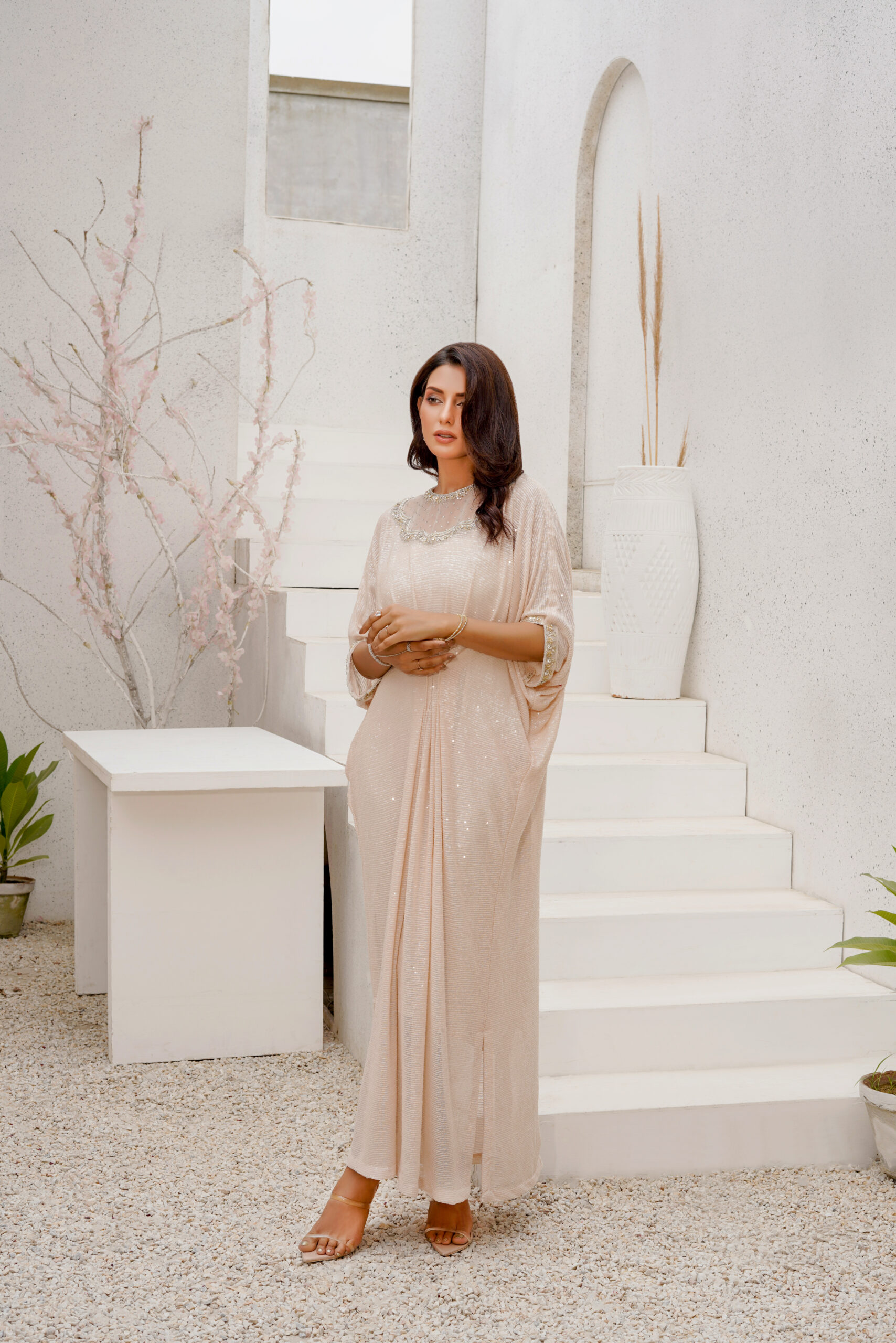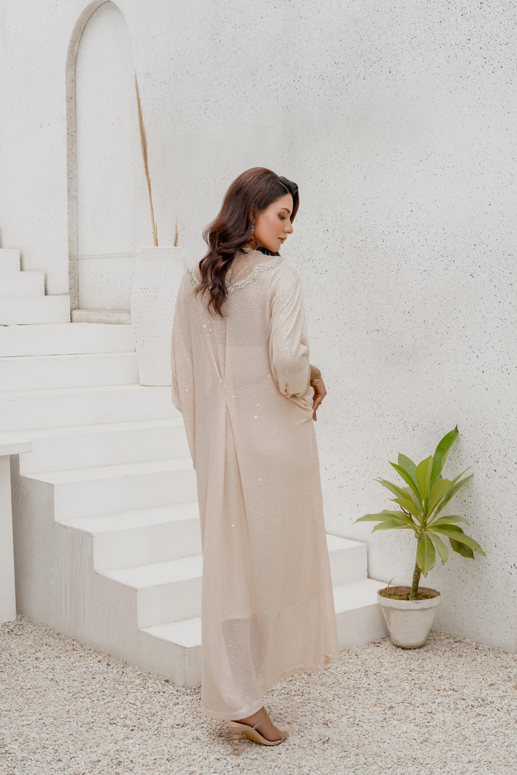 “Moonlight Amour” a Sequin Kaftan Dress that seamlessly combines opulence and comfort. Crafted with exquisite sequin material, its kaftan-style silhouette drapes elegantly around your body offering comfort and style. It is adorned with intricate Zardozi detailing on the front, back, and sleeves, accented by Swarovski crystals, stones, and Dabka work. The luxurious cotton silk inner slip ensures a plush feel against your skin. Designed with high-quality fabrics & thoughtful tailoring, Whether you’re attending a wedding or simply enjoying a leisurely evening, this Kaftan will radiate opulence effortlessly.