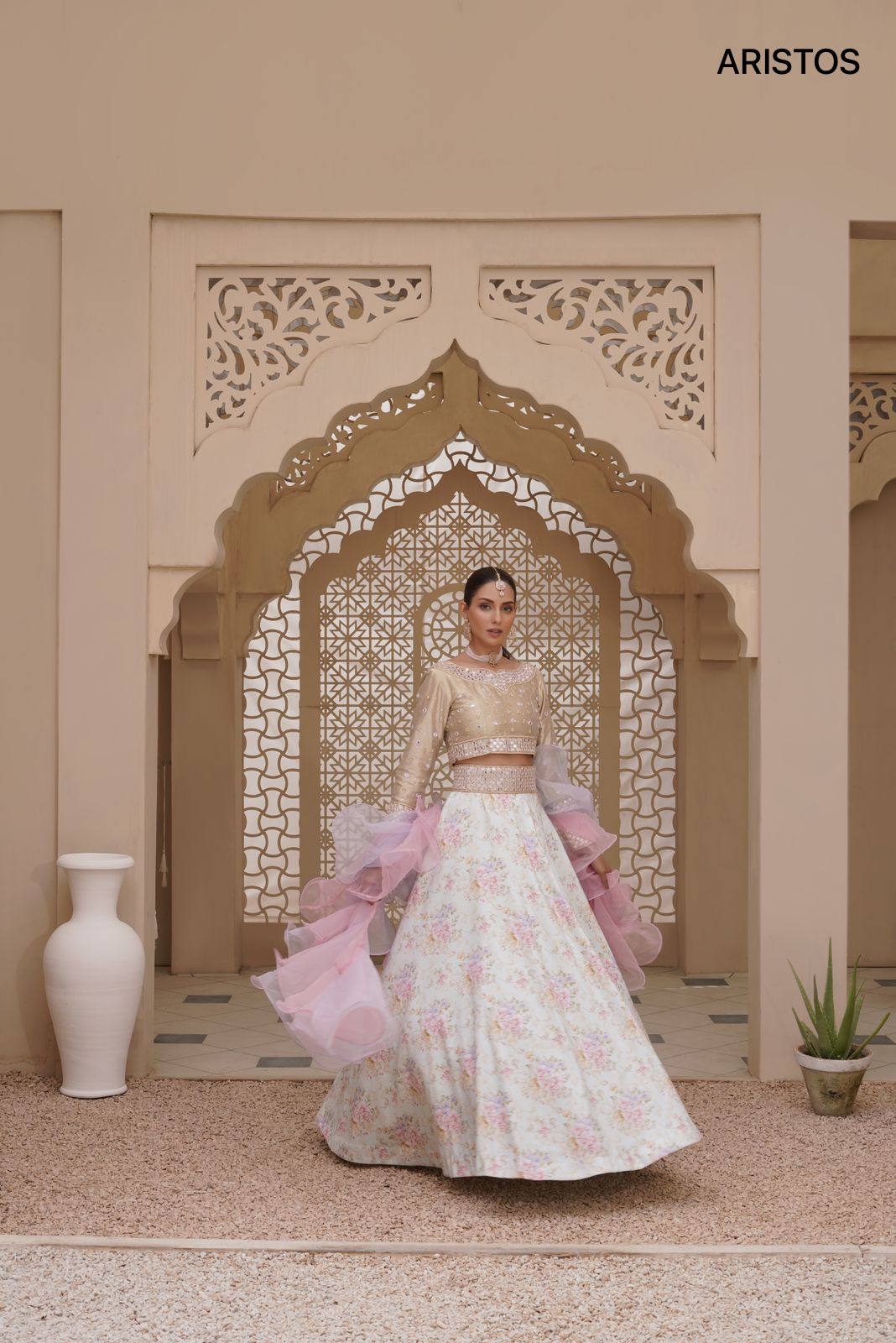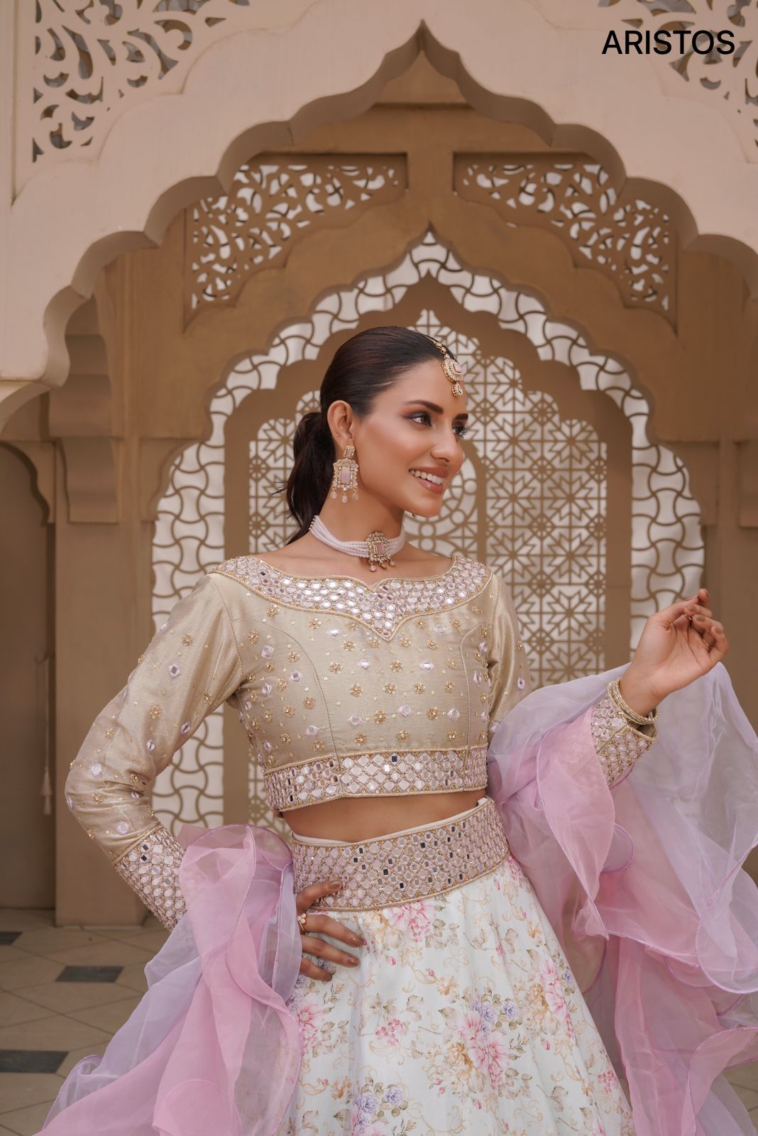 “Mughal Floral Adaa”: A name that encapsulates the beauty and charm of this Royal ensemble, this lehnga choli is designed to make you stand out with grace and flair. Its Lehnga is a masterpiece crafted from fine quality floral printed raw silk material, ensuring a luxurious and elegant look. The choli, made from lamar material, is a canvas of artistry, adorned with a beautiful blend of mirror and zardozi work, adding a touch of grandeur to your ensemble. To complete the modern twist, we’ve paired it with a ruffled dupatta, giving you a truly unique and stylish look that’s perfect for any special occasion.