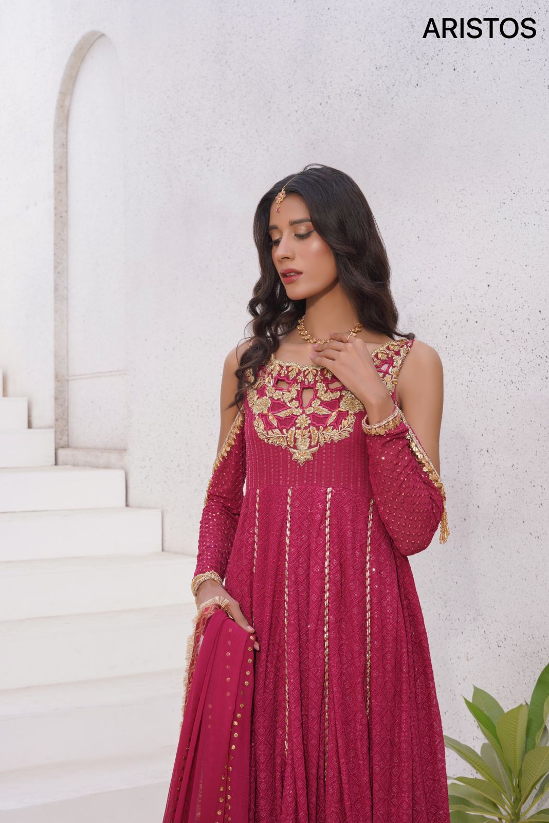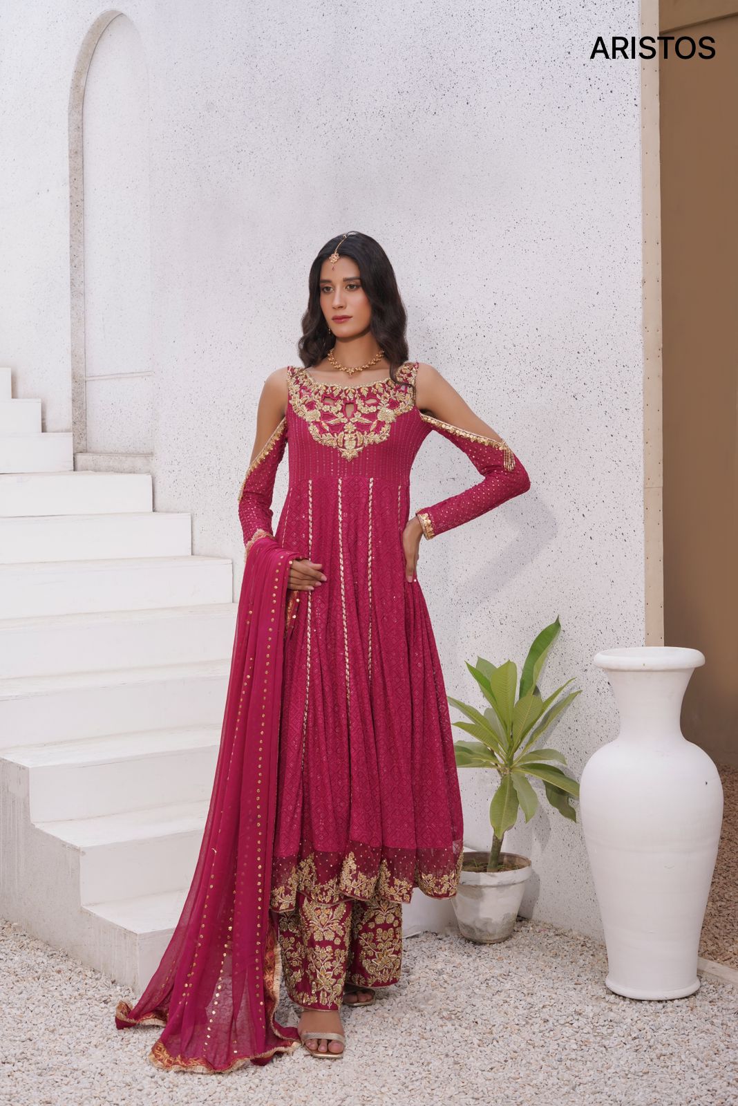 “Zeba-e-ishq” is a symbol of modern elegance infused with the richness of tradition. This short-length Kalidaar dress, graced with cold shoulders, gives it a trendy and contemporary edge that’s perfect for modern fashionistas. Its exquisite zirdozi work, accentuated by kora,dabka and stones, is a testament to opulence. The ensemble is completed with heavily embellished pants that mirror the dress’s splendour, and a dupatta featuring Mukesh lining and gota kinari. “Zeba e ishq” isn’t just an outfit; it’s a modern masterpiece, a true work of art. Wear it to stand out at any event, and let its elegance and tradition define your style.